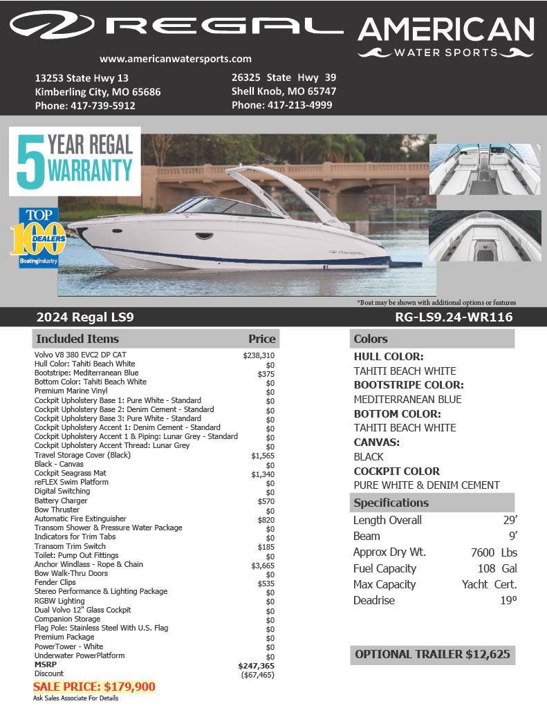 American Water Sports is a Boating Industry Top 100 Dealer and an authorized Regal dealer serving Table Rock Lake, Bull Shoals Lake, and the Ozarks from two convenient locations in Kimberling City and Shell Knob, Missouri. Our certified service team handles Volvo Penta and Regal warranty service in-house, and every boat we sell is delivered with a full pre-delivery inspection and on-water orientation. Whether you’re shopping Regal LS9 boats for sale in Missouri, Arkansas, Oklahoma, Kansas, or anywhere in the Midwest, we make luxury boat ownership simple from day one.