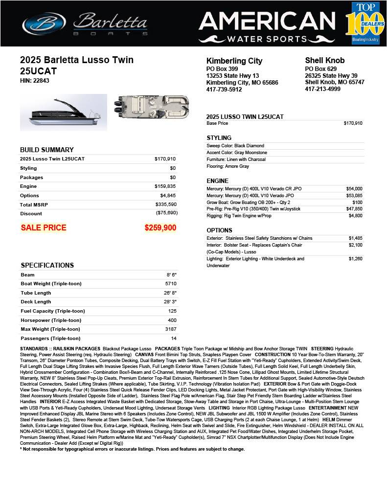 American Water Sports is a Boating Industry Top 100 Dealer and an authorized Barletta Pontoons dealer serving Table Rock Lake, Beaver Lake, Bull Shoals, and the Ozarks from two convenient locations in Kimberling City and Shell Knob, Missouri. Our Mercury-certified service team handles Verado warranty work and joystick system setup in-house, and every Barletta we deliver comes with a full pre-delivery inspection, propeller calibration, and on-water orientation. Whether you’re shopping Barletta Lusso pontoons for sale in Missouri, Arkansas, Oklahoma, Kansas, or anywhere in the Midwest, we make luxury pontoon ownership simple from day one.