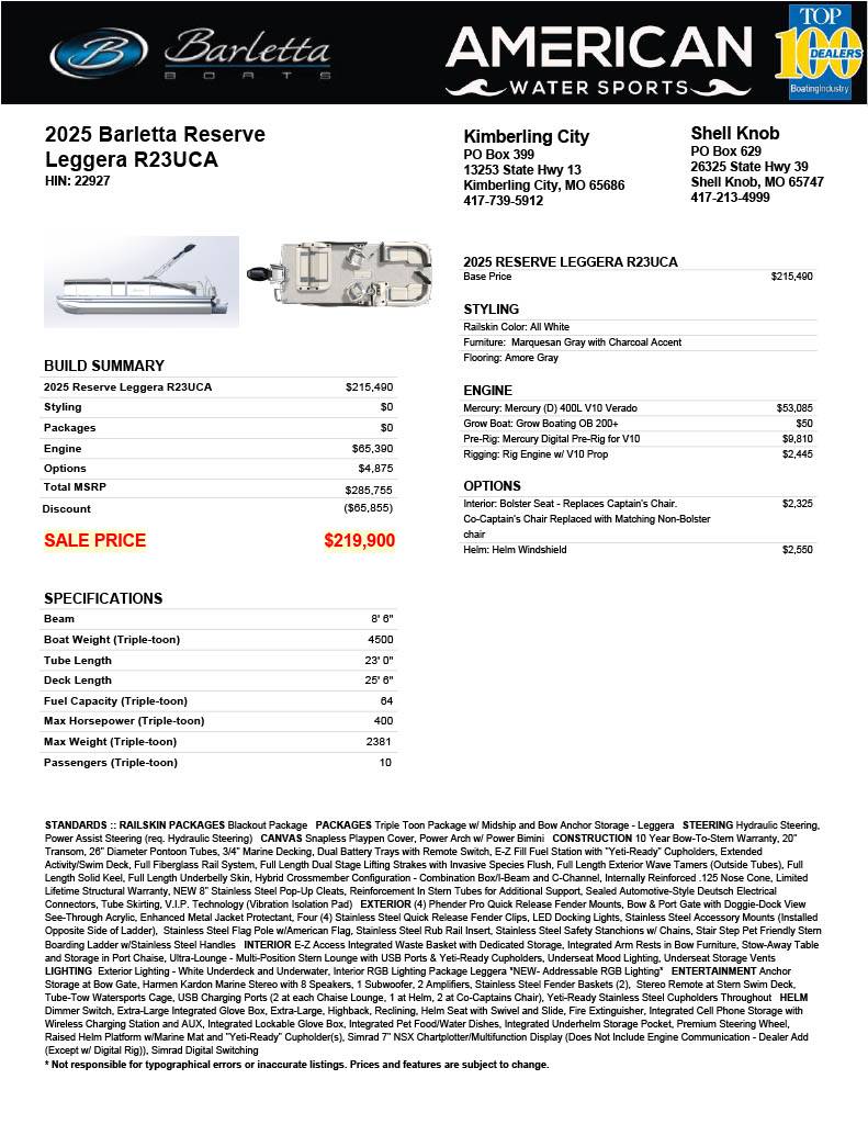 The BARLETTA Reserve Leggera 23UCA 2025 exemplifies luxury, performance, and innovation all in one sleek pontoon boat. Designed for those who seek both comfort and adventure on the water, this model offers an impressive array of standard features that enhance your boating experience while ensuring safety, style, and convenience. Whether you’re hosting friends, enjoying family outings, or exploring new waterways, the Reserve Leggera 23UCA is engineered to exceed expectations. Key standard features include: - **Premium Construction: ** Built with high-quality marine-grade aluminum and durable materials to ensure long-lasting reliability and a smooth, stable ride. - **Luxurious Seating: ** Plush, ergonomically designed seats with premium upholstery provide exceptional comfort and ample seating for up to 12 passengers. - **Innovative Helm Station: ** State-of-the-art helm with a fully integrated digital display, ergonomic controls, and a stainless-steel steering wheel for precise handling. - **Powerful Performance: ** Equipped with a high-efficiency outboard motor, delivering reliable power and exceptional fuel economy for smooth cruising and exciting acceleration. - **Advanced Sound System: ** Integrated Bluetooth-enabled stereo system with multiple speakers strategically placed to provide premium audio entertainment both on and off the water. - **Spacious Deck Layout: ** Thoughtfully designed open floor plan with plenty of room for movement, sunbathing areas, and versatile seating configurations. - **High-Capacity Bimini Top: ** Retractable and adjustable Bimini top offers ample shade and protection from the sun, enhancing comfort during hot days. - **Convenient Storage Solutions: ** Multiple spacious compartments and under-seat storage options provide plenty of room for gear, safety equipment, and personal belongings. - **Safety Features: ** Includes integrated LED navigation lights, fire extinguisher holder, and built-in safety rails to ensure a secure boating experience. - **Luxury Amenities: ** Standard onboard freshwater system with sink, premium carpeting, and optional folding tables for added convenience and entertainment. Experience boating at its finest with the BARLETTA Reserve Leggera 23UCA 2025 — where thoughtful design meets unparalleled quality for unforgettable moments on the water.