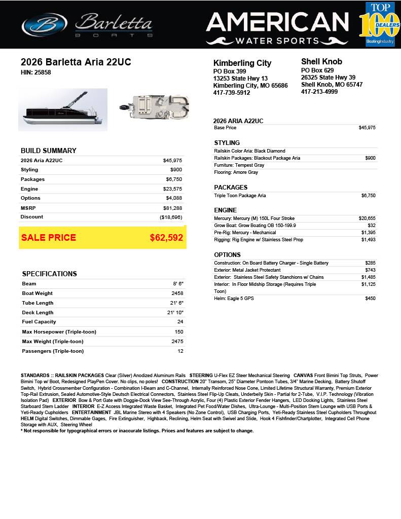 The Barletta Aria A22UC 2026 is a premium pontoon boat designed to deliver exceptional comfort, performance, and style for unforgettable boating experiences. Equipped with an array of thoughtfully integrated features, this model promises to elevate your time on the water. Below are some of the standout standard features that come with the Barletta Aria A22UC 2026: - **Spacious Deck Layout: ** Expansive deck space with versatile seating arrangements, providing ample room for family and friends to relax and socialize comfortably. - **Luxurious Seating: ** Plush, high-quality upholstery with ergonomic design ensures long-lasting comfort for all passengers, coupled with sturdy armrests and ample storage underneath. - **Advanced Helm Station: ** Featuring a user-friendly control panel with modern instrumentation, including a multi-function digital display, easy-to-reach throttle and steering controls for precise handling. - **Powerful and Efficient Engine: ** Includes a robust outboard motor engineered for smooth acceleration, fuel efficiency, and reliable performance in various water conditions. - **Marine-Grade Sound System: ** Integrated high-quality speakers with Bluetooth connectivity, delivering crystal-clear audio for an enhanced onboard entertainment experience. - **LED Lighting Package: ** Energy-efficient, stylish LED lights for enhanced visibility and ambiance during evening rides, including navigation, courtesy, and accent lighting. - **Weather-Resistant Materials: ** Constructed with durable, fade-resistant materials and corrosion-resistant fittings to ensure longevity even in harsh marine environments. - **Ample Storage Compartments: ** Multiple dedicated storage areas throughout the boat keep gear, personal items, and safety equipment neatly organized and easily accessible. - **Safety Features: ** Equipped with necessary safety gear including life jacket storage, fire extinguisher holder, and non-skid flooring for secure footing. - **Aerodynamic and Sleek Design: ** The boat's modern aerodynamic design not only looks sophisticated but also improves fuel efficiency and stability on the water. These standard features combine to make the Barletta Aria A22UC 2026 a versatile and reliable pontoon boat that meets the needs of boating enthusiasts who seek both comfort and performance on their aquatic adventures.