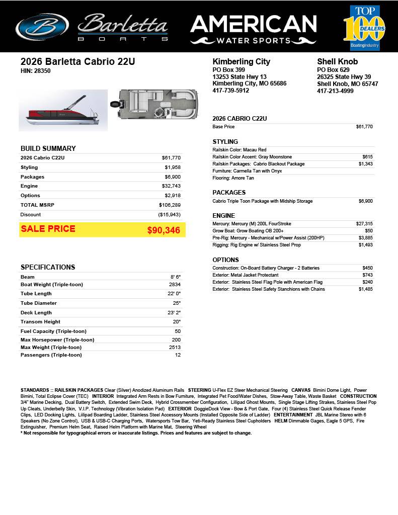 Experience luxury, performance, and comfort combined in the all-new Barletta CABRIO 22U 2026. This premium pontoon boat is designed to elevate your time on the water with advanced features, superior craftsmanship, and thoughtful amenities. Here are some of the standout standard features that make the Barletta CABRIO 22U a top choice for boating enthusiasts: - **Spacious Seating and Premium Upholstery: ** Enjoy ample seating with high-quality, marine-grade vinyl that is both durable and easy to clean, providing comfort for family and friends throughout your journey. - **Powerful Outboard Engine: ** Equipped with a reliable and fuel-efficient outboard motor, delivering smooth performance and excellent maneuverability on various water conditions. - **Modern Helm Station: ** Features a user-friendly dashboard with integrated instrumentation including a multifunction gauge cluster, USB charging ports, and premium steering wheel for precision control. - **Enhanced Safety Features: ** Includes stainless steel grab rails, non-slip decking, and navigation lights to ensure a secure and safe boating experience. - **Bimini Top with Integrated LED Lighting: ** Provides ample shade during sunny days and stylish LED lighting for evening excursions, adding both comfort and ambiance. - **Ample Storage Solutions: ** Multiple storage compartments including under-seat storage and lockable compartments to keep your gear organized and protected. - **Stereo System with Bluetooth Connectivity: ** Enjoy your favorite music on the water with a high-quality marine stereo system that offers Bluetooth connectivity and multiple speakers strategically placed for optimal sound. - **Durable, Lightweight Aluminum Construction: ** Ensures longevity, corrosion resistance, and improved fuel efficiency without compromising strength. - **Customizable Layout Options: ** Allows you to tailor your boat’s configuration to match your lifestyle and preferences, whether for lounging, fishing, or entertaining. - **Innovative Flooring: ** Features premium finish flooring that combines durability with aesthetic appeal for easy maintenance and stylish looks. With these impressive standard features, the Barletta CABRIO 22U 2026 stands out as a versatile, luxurious, and reliable pontoon boat designed to make every outing unforgettable. Whether you're planning a relaxing day on the lake or a fun-filled adventure with friends, this boat delivers exceptional value and performance.
