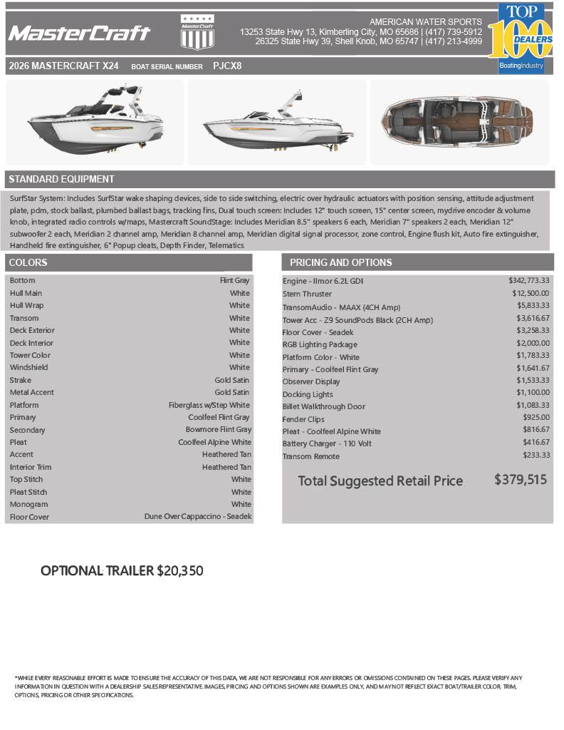 The MasterCraft X24 2026 is designed to deliver an unmatched boating experience, combining cutting-edge technology with exceptional craftsmanship. This model is perfect for water sports enthusiasts who demand power, precision, and comfort on the water. Engineered with advanced features and innovative design elements, the MasterCraft X24 2026 sets a new standard in luxury and performance boats. **Key Features: ** - **Revolutionary Surf Technology: ** Equipped with the Gen 2 Surf System, the X24 2026 produces customizable and perfectly shaped wakes, ideal for surfing enthusiasts at every skill level. - **Powerful Engine: ** Powered by an efficient yet robust V8 engine, providing impressive torque and acceleration for smooth and exhilarating rides. - **Spacious Interior: ** Thoughtfully designed seating for up to 18 passengers, with ergonomic layouts and premium upholstery ensuring maximum comfort during long outings. - **Advanced Infotainment System: ** Integrated touchscreen display with Bluetooth connectivity, navigation, and stereo audio system for seamless entertainment on the water. - **Innovative Hull Design: ** The WakeShift 3.0 hull technology enhances stability and wake control, allowing for precise handling and a smoother ride. - **Customizable Ballast System: ** Industry-leading ballast tanks that can be quickly adjusted to modify wake size and shape, catering to different water sports like wakeboarding, wakesurfing, and tubing. - **Durable Construction: ** Built with high-quality materials and a reinforced fiberglass hull for long-lasting performance and resistance to harsh marine environments. - **Safety and Convenience: ** Features integrated LED lighting, non-slip decking, and multiple storage compartments for gear, ensuring safety and practicality. - **Fuel Efficiency: ** Advanced fuel management system optimizing power output and fuel consumption, allowing for longer trips without frequent refueling. Experience the perfect blend of luxury, power, and innovation with the MasterCraft X24 2026 – designed to elevate every moment on the water.