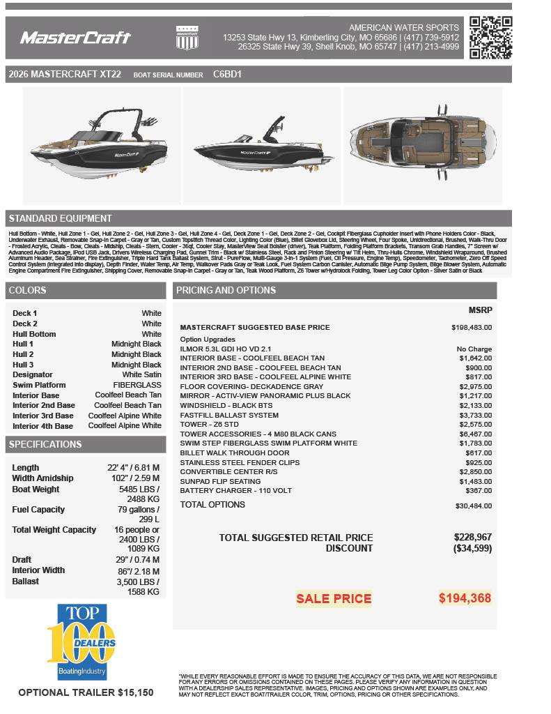 MasterCraft XT22 2026 – Premium Performance and Luxury in One Package** The MasterCraft XT22 2026 is engineered to deliver an exceptional boating experience, combining advanced technology, superior craftsmanship, and stylish design. This versatile wakeboard and wakesurf boat is perfect for enthusiasts looking to elevate their time on the water with top-tier performance and comfort. Here are some of the standout features that make the XT22 a leader in its class: - **Powerful Engine Performance: ** Equipped with a high-output V8 engine that provides ample horsepower, ensuring impressive speed, acceleration, and towing power for all your water sport's needs. - **Precision Wake Shaping: ** Features MasterCraft’s innovative Gen 2 Surf System, including the WakeShift adjustable wave plate and Power Wedge II, allowing you to customize the size and shape of your wake for perfect wakeboarding and wakesurfing conditions. - **Luxurious Interior: ** Spacious cockpit with premium marine-grade upholstery, ergonomic seating, and customizable color options to provide unmatched comfort for you and your guests. - **Advanced Infotainment System: ** Intuitive touchscreen display with Bluetooth connectivity, GPS navigation, and onboard audio system, delivering seamless entertainment and control while on the water. - **Durable Hull Design: ** Crafted with a strong yet lightweight hull for enhanced stability, superior handling, and fuel efficiency. - **Integrated Tower with Racks: ** Sturdy, powder-coated wakeboard tower equipped with racks for convenient storage and easy access to your gear. - **Ample Storage Space: ** Multiple lockable storage compartments designed for your safety and convenience, keeping equipment dry and organized. - **Safety and Convenience Features: ** Equipped with advanced safety systems, including LED lighting, non-slip flooring, and ergonomic handrails, ensuring a secure and enjoyable ride. - **Customizable Options: ** Extensive range of factory and dealer-installed options to tailor your boat to your specific preferences and lifestyle. Experience unparalleled craftsmanship and functionality with the MasterCraft XT22 2026, the ultimate boat for water sports enthusiasts who demand excellence on every wave.