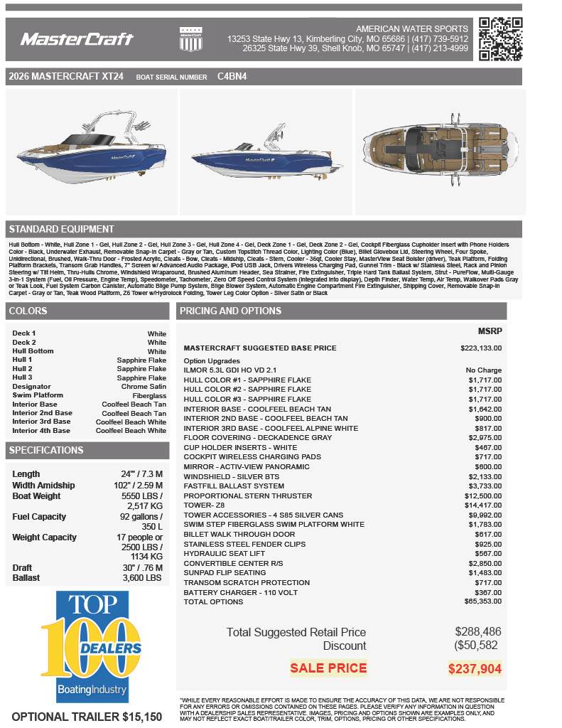 The MasterCraft XT24 2026 is expertly engineered to deliver an exceptional boating experience, combining cutting-edge technology, superior craftsmanship, and versatile functionality. Designed for enthusiasts who demand both performance and luxury, this model offers a perfect blend of power, innovation, and style to elevate your time on the water. **Key Features: ** - **Advanced Wake Shaping Technology: ** Equipped with the patented Gen 2 Surf System™, the XT24 allows you to customize your wake for the perfect surf or wakeboarding experience, ensuring smooth, consistent waves for riders of all skill levels. - **Powerful and Efficient Engine: ** Powered by a robust 6.6L V8 engine, the XT24 provides impressive horsepower while maintaining fuel efficiency, delivering thrilling acceleration and reliable performance. - **Luxurious and Spacious Interior: ** The boat features premium marine-grade upholstery, spacious seating for up to 18 passengers, and clever storage compartments designed for maximum comfort and convenience. - **Innovative Control System: ** The intuitive touchscreen interface with MasterCraft Connect™ seamlessly integrates boat operation, music, and ride settings, giving you full control at your fingertips. - **State-of-the-Art Safety Features: ** Includes advanced navigation lighting, a reinforced hull design, and industry-leading safety equipment to ensure peace of mind on every adventure. - **Customizable Exterior Design: ** Available in a range of vibrant color schemes and graphic options, allowing you to personalize your XT24 to reflect your style. - **Enhanced Tow Capabilities: ** Features a durable, adjustable tower with integrated speakers and tow points, perfect for wakeboarding, tubing, and waterskiing enthusiasts. Experience the MasterCraft XT24 2026 and discover why it’s the preferred choice for water sports lovers seeking unmatched performance, comfort, and style.